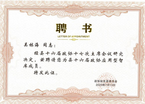 我所主任會(huì)計(jì)師吳林海同志被政協(xié)如東縣委員會(huì)2023年7月13日聘為縣十六屆政協(xié)應(yīng)用型智庫(kù)成員。