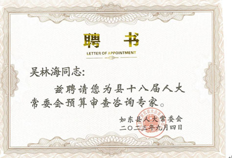 被聘為如東縣人大常委會(huì)2023年9月4日聘為縣十八屆人大常委會(huì)預(yù)算審查咨詢(xún)專(zhuān)家。