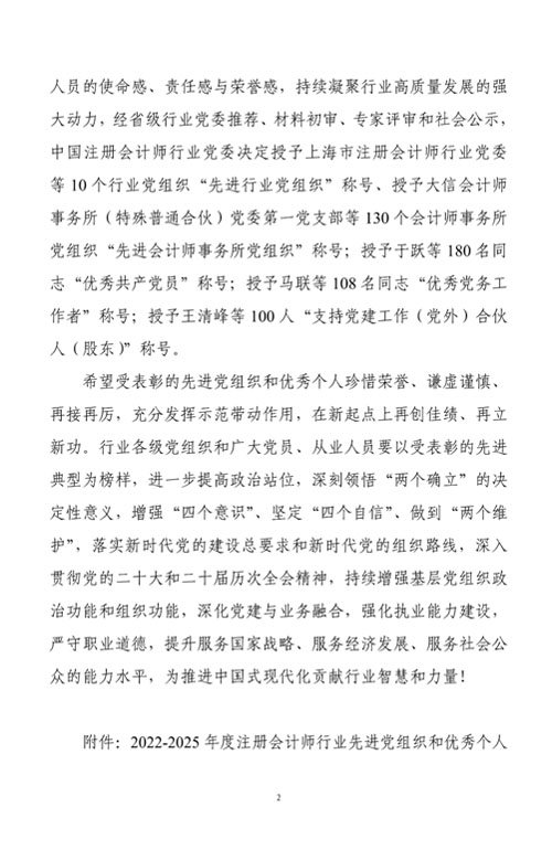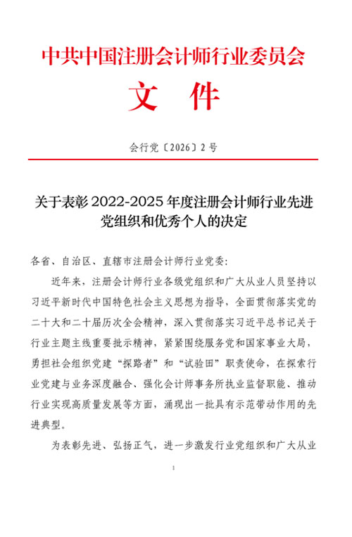 近日,收到中共中國注冊會計師行業(yè)委員會文件《關(guān)于表彰2022-2025年度注冊會計師行業(yè)先進黨組織和優(yōu)秀個人的決定》,我所主任會計師吳林海同志榮獲注冊會計師行業(yè)“優(yōu)秀黨務(wù)工作者”稱號。
